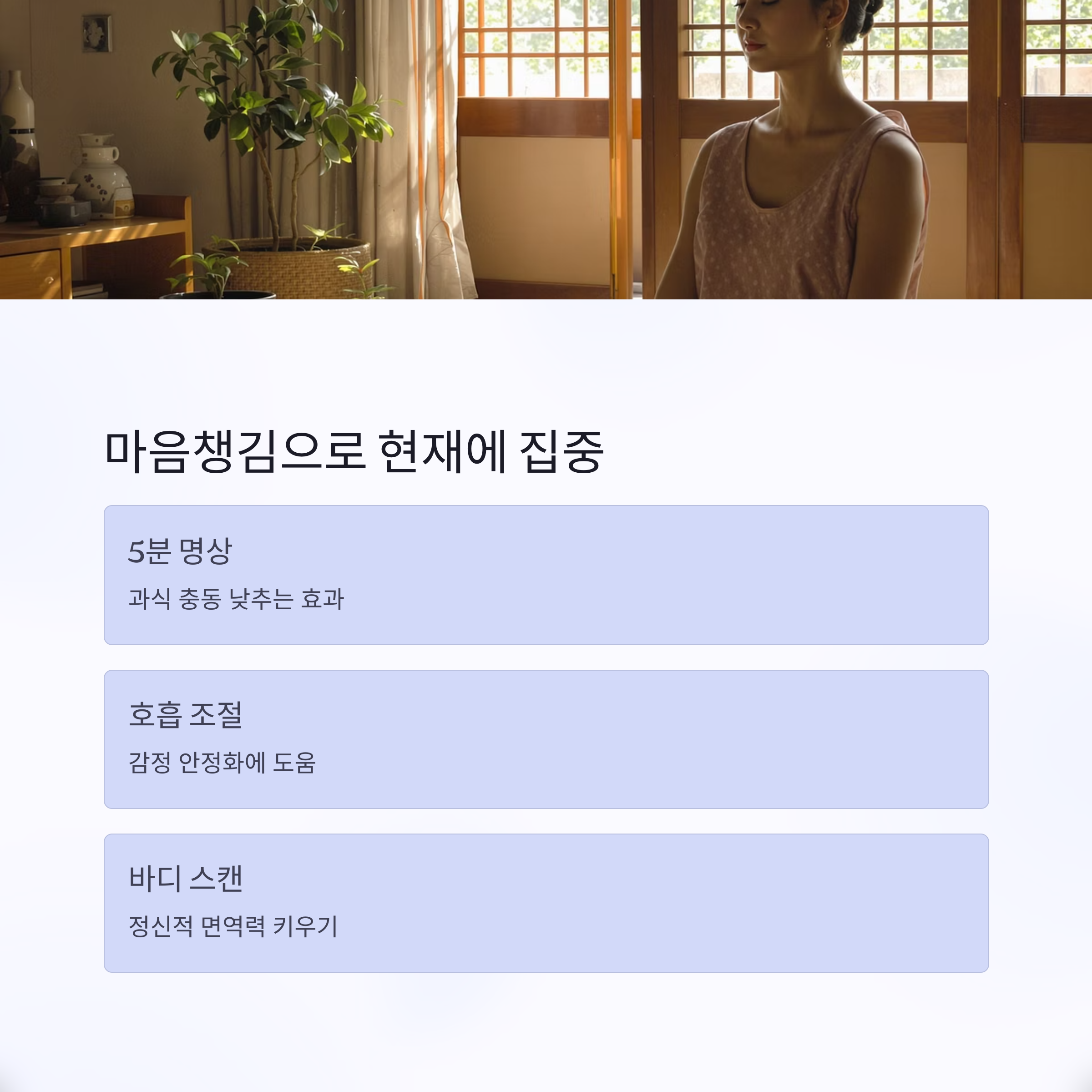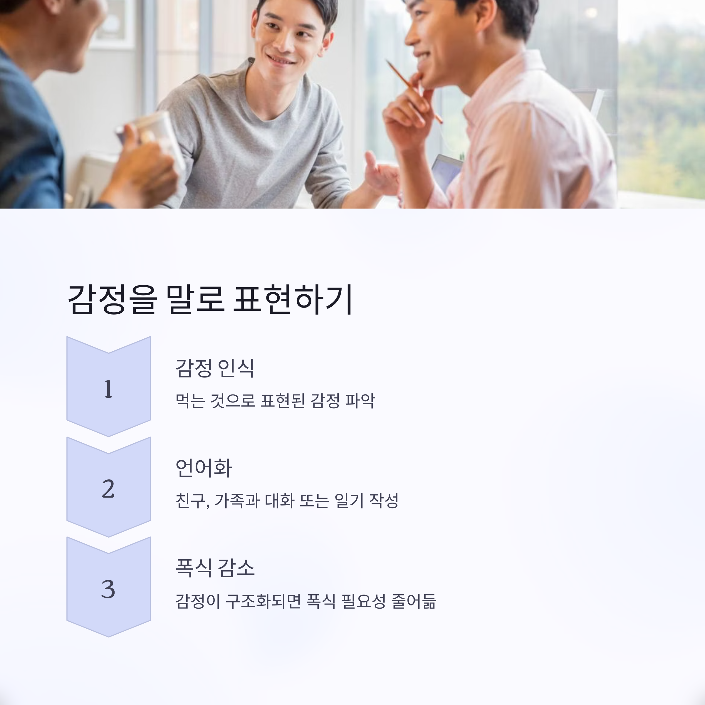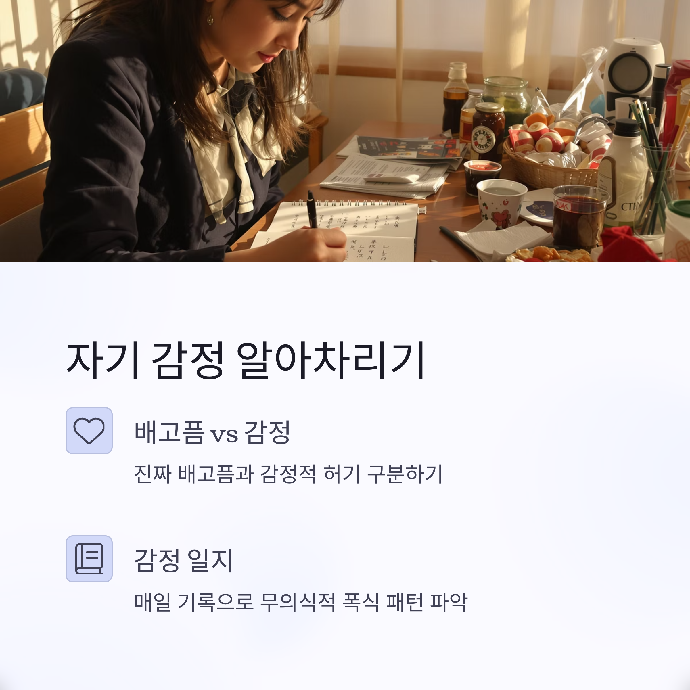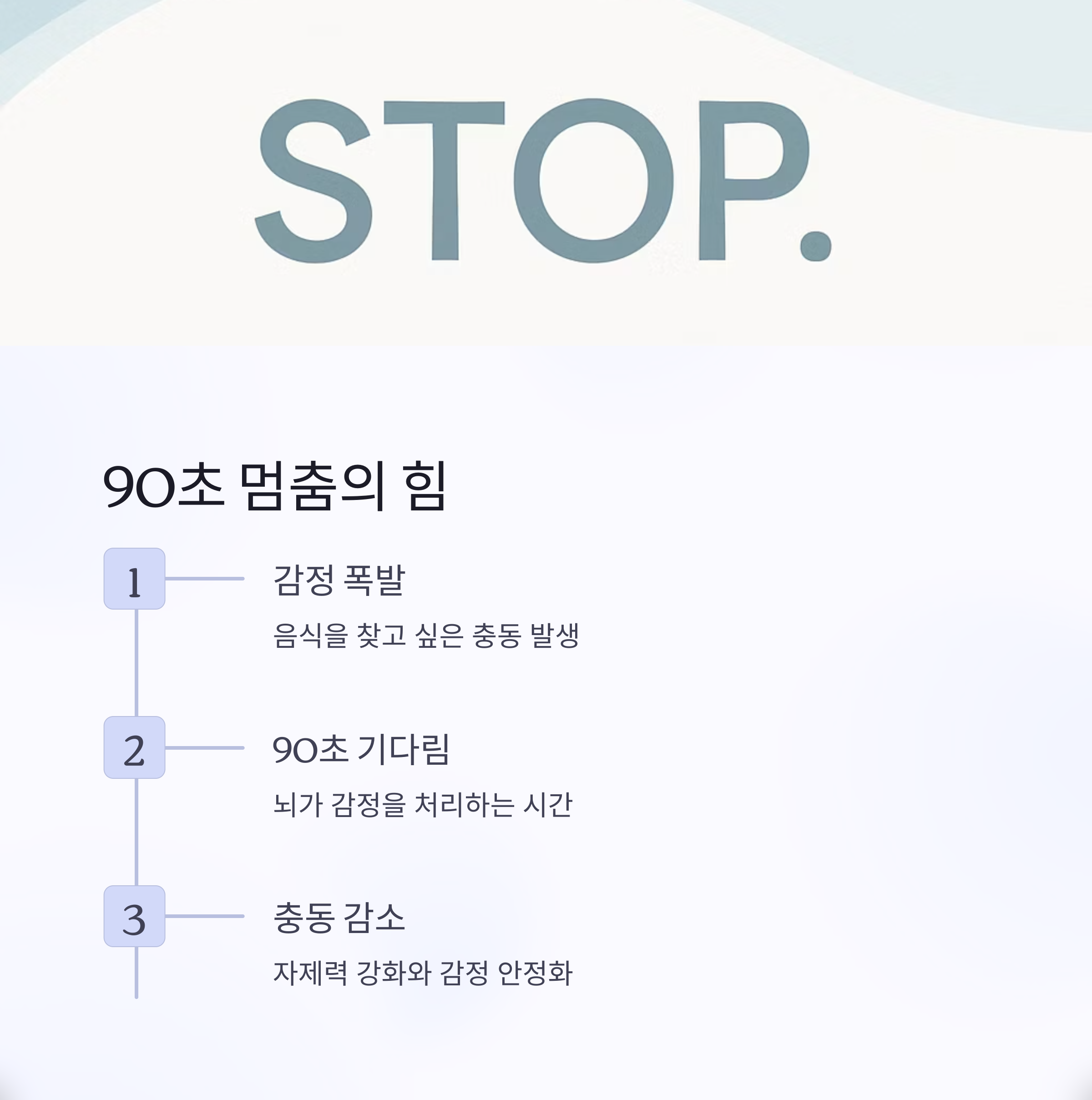 | 감정 패턴 파악을 통해 무의식적 폭식을 줄임 | 충동 순간에 스스로를 멈추는 자제력 훈련 | 하루를 통제하는 작은 루틴으로 감정 안정 |