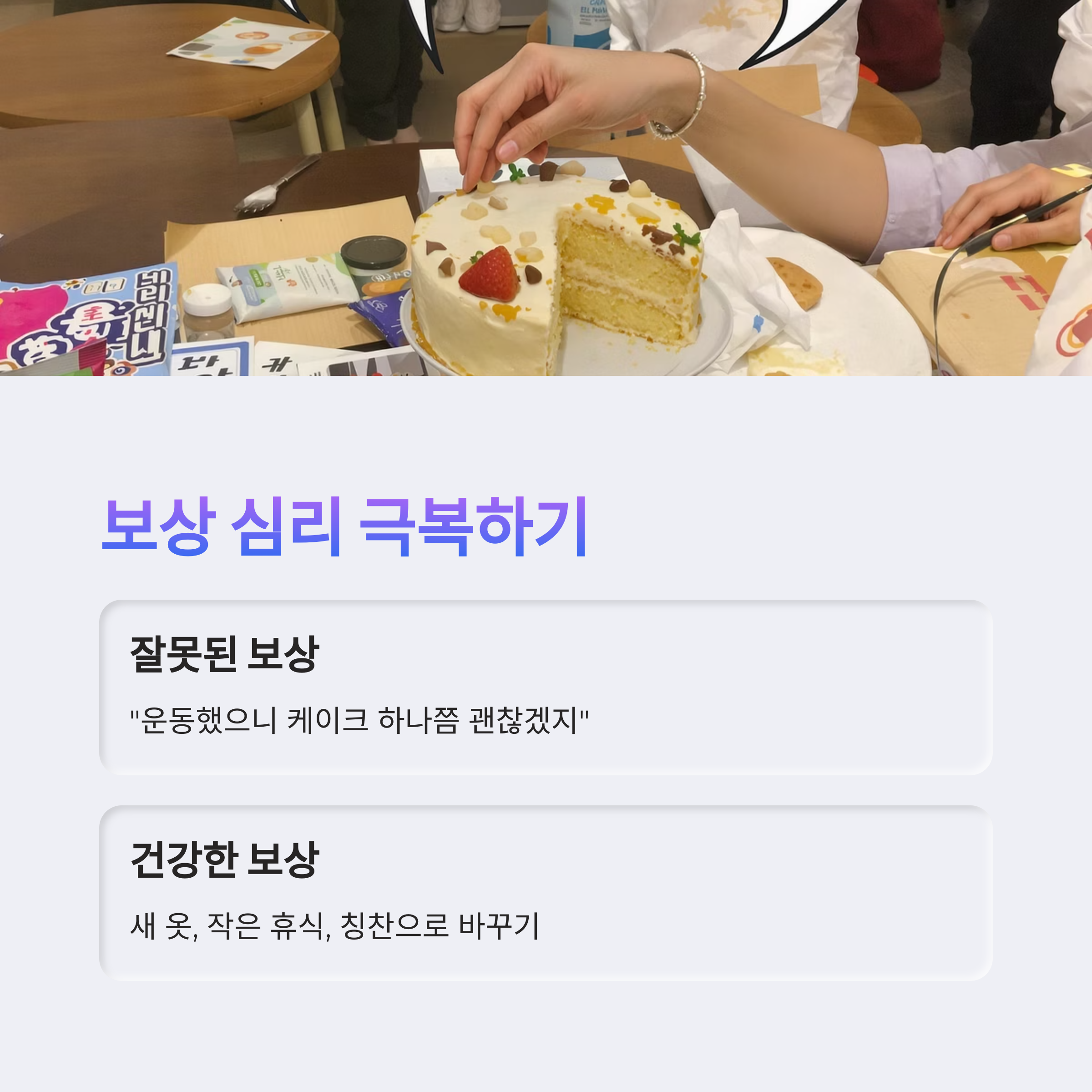 | 보상 심리란? | 운동 후 간식을 먹으며 자신을 위로하려는 심리입니다. |