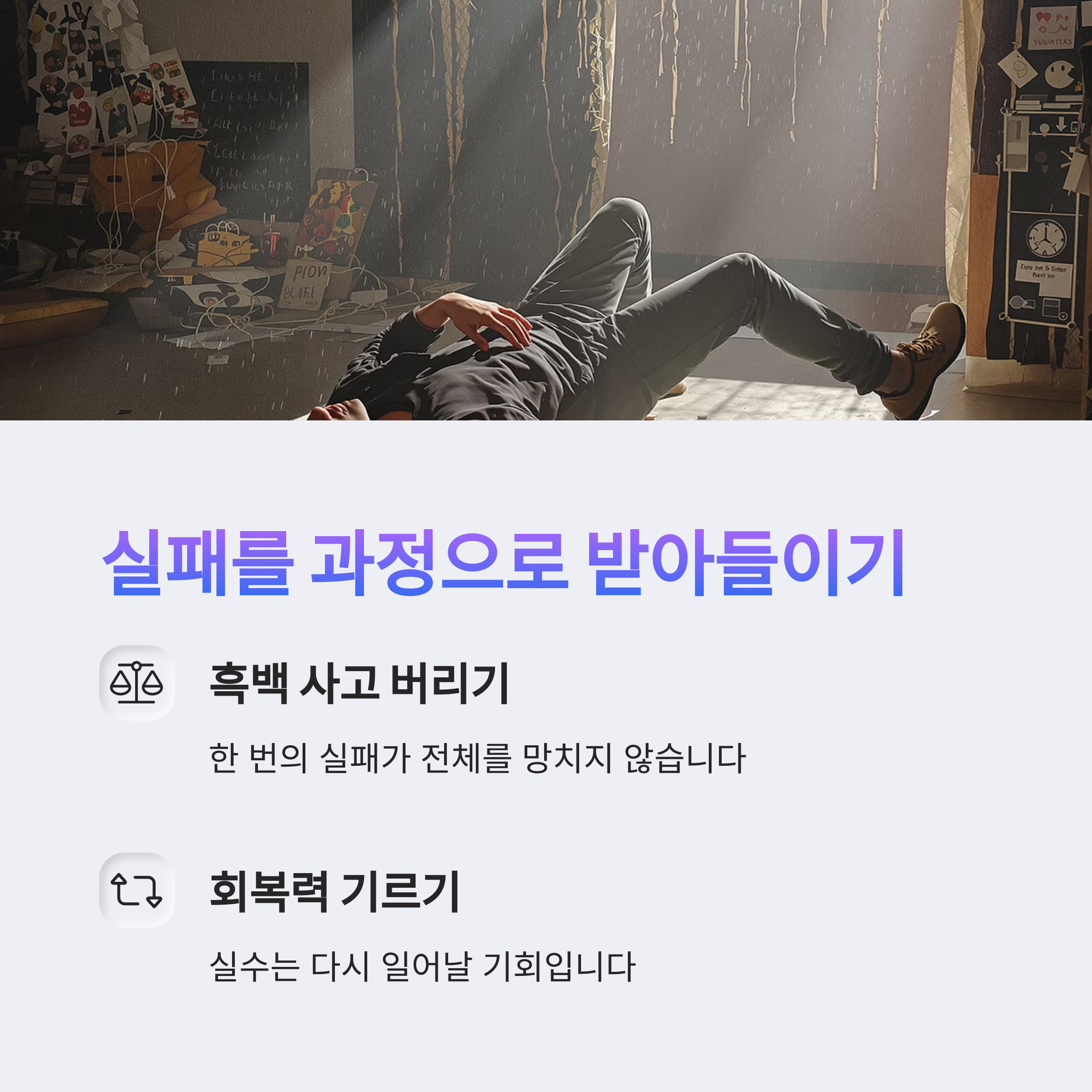 한 번의 실수로 모든 노력이 물거품이 되었다고 느끼는 ‘흑백 사고’ 또한 주의해야 합니다. 예를 들어 밤에 폭식을 한 다음날 ‘어차피 망했으니 오늘도 먹자’는 생각은 다이어트 실패를 반복하게 만드는 원인입니다. 작은 실수를 과정의 일부로 받아들이고 회복의 기회로 삼는 태도가 필요합니다. 실패는 끝이 아니라 다시 시작하는 지점입니다.