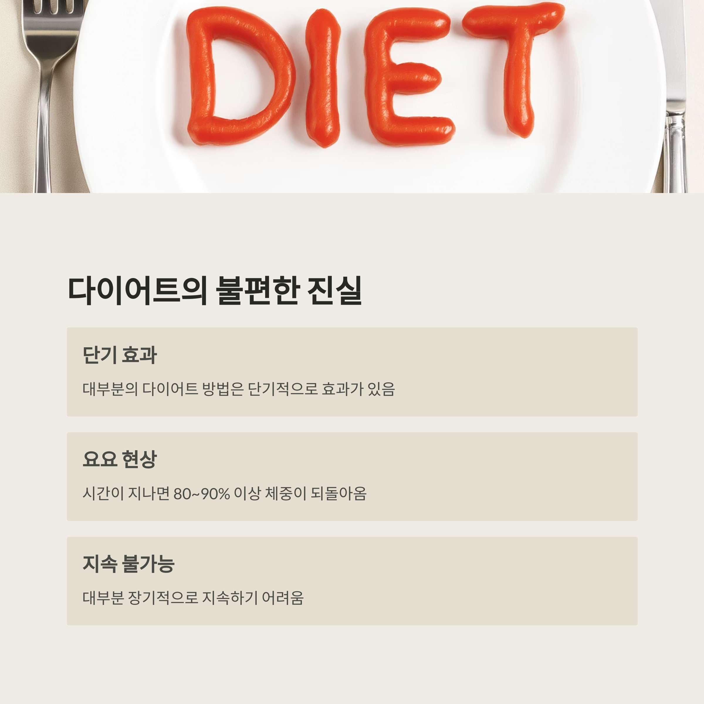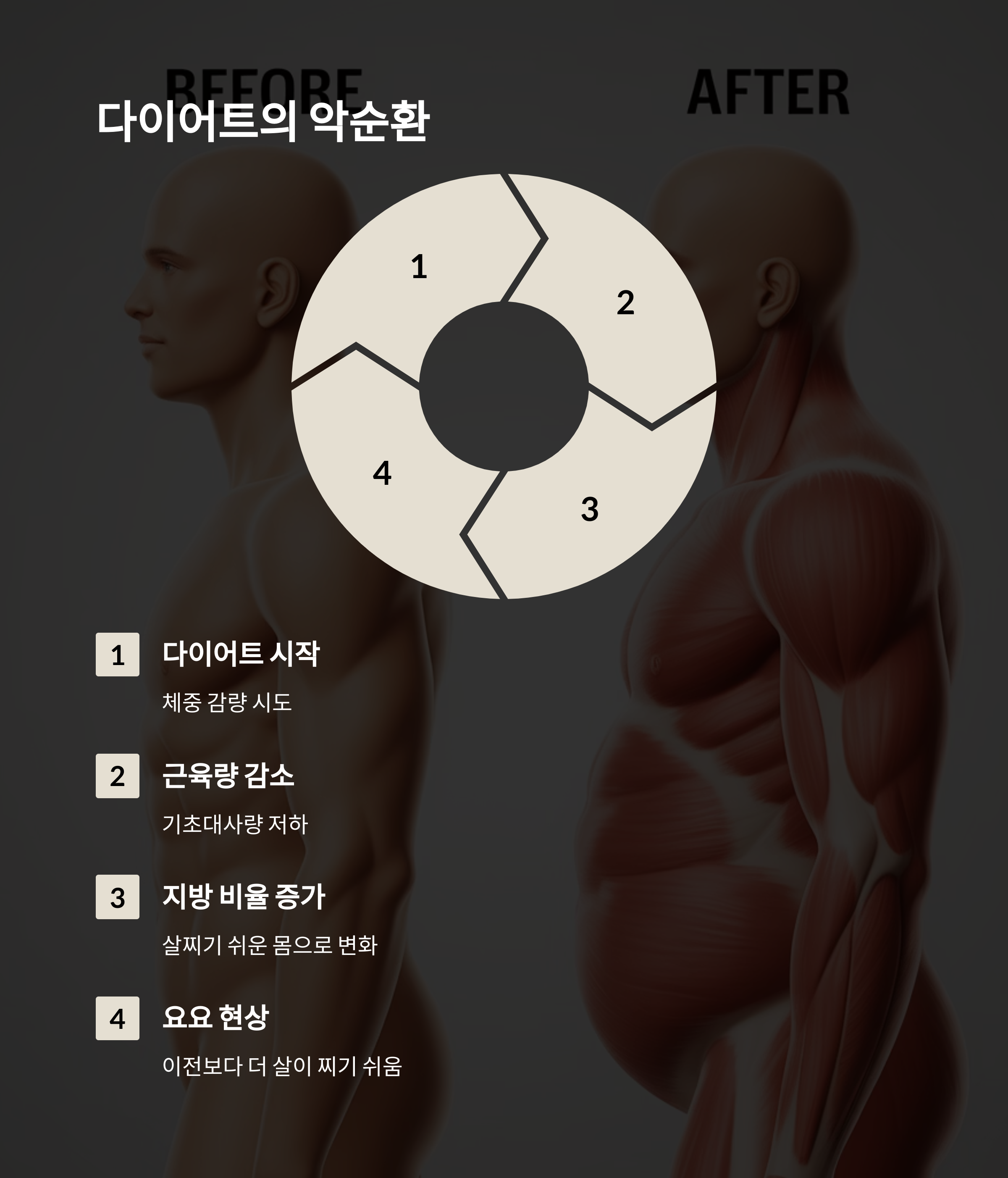 다이어트와 식이요법을 반복하면 근육량은 감소하고 지방 비율은 높아져 몸의 기초대사량이 낮아집니다. 결국 지방이 더 쉽게 축적되는, 즉 '살찌기 쉬운 몸'으로 변하게 됩니다.
