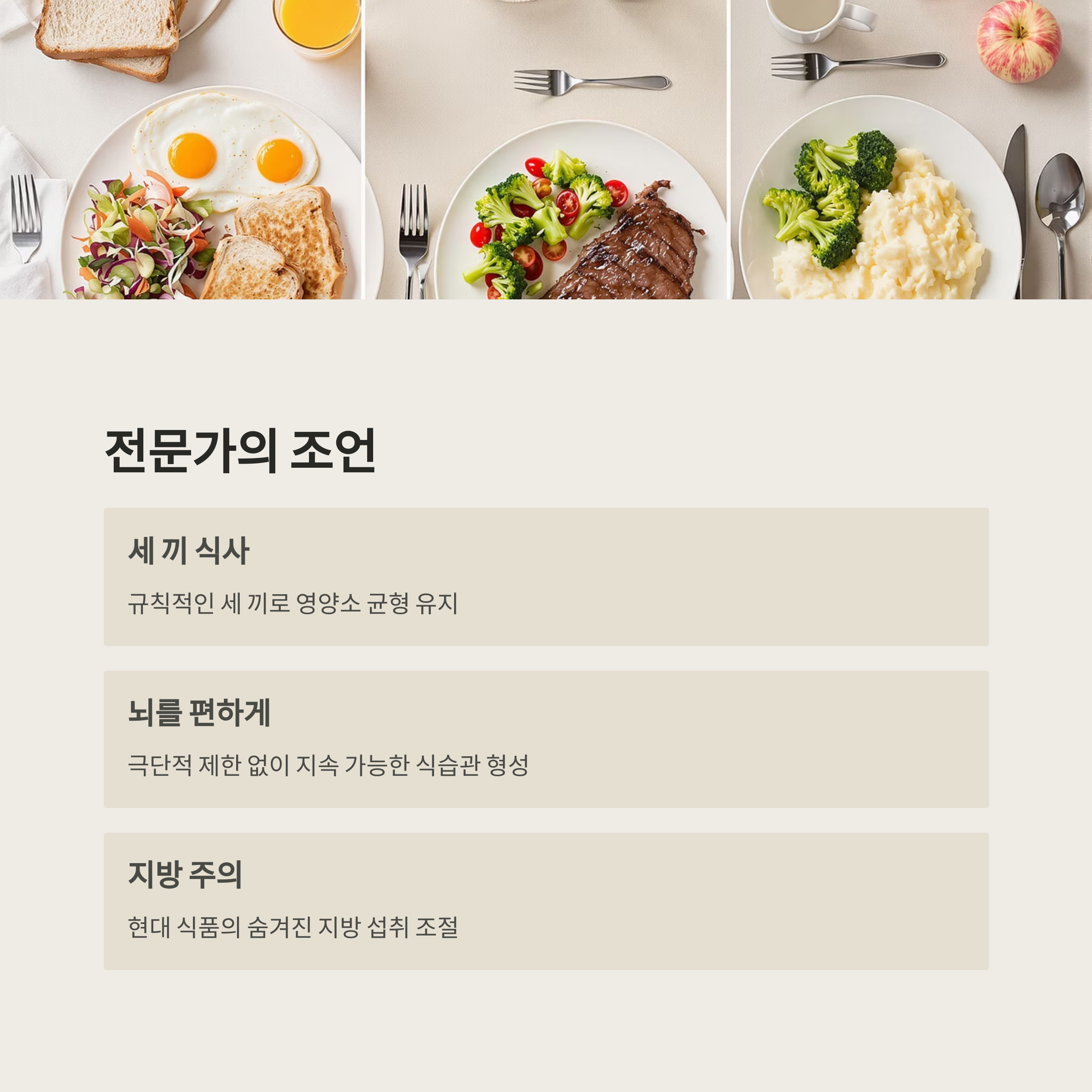 오 교수는 결국 세 끼를 먹으며 영양소 균형을 맞추는 '뇌를 편하게 하는 다이어트'가 장기적인 체중 감량과 건강 유지에 가장 효과적인 방법이라고 조언합니다. 다만 현대 사회에서는 김밥에 바르는 참기름 등 무심코 섭취하는 지방이 너무 많아 지방 섭취를 조심할 필요가 있다고 덧붙였습니다.