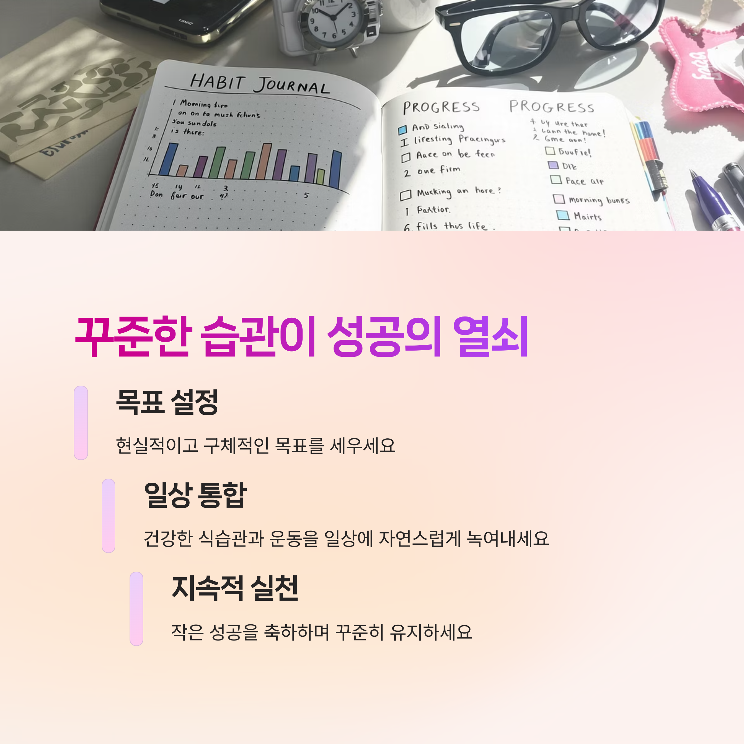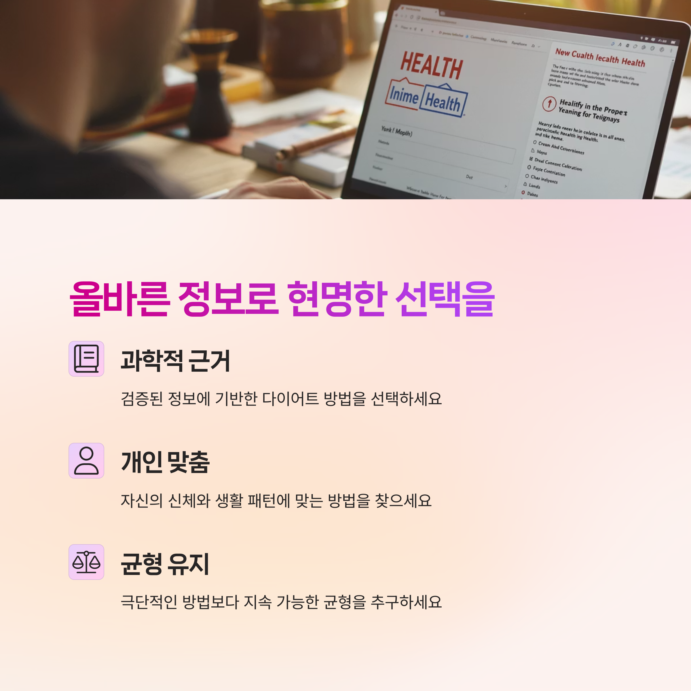 오늘은 우리가 흔히 믿고 있는 다이어트 상식 중 일부가 실제로는 잘못된 정보일 수 있다는 점을 살펴보았습니다. 다이어트는 단순히 체중을 줄이는 것이 아니라, 올바른 방법으로 건강을 지키며 지속 가능한 습관을 만들어가는 과정입니다. 여러분도 자신에게 맞는 속도와 방법을 찾고, 유행보다는 기본에 충실한 다이어트를 실천해보세요. 언제나 건강한 삶을 응원합니다.