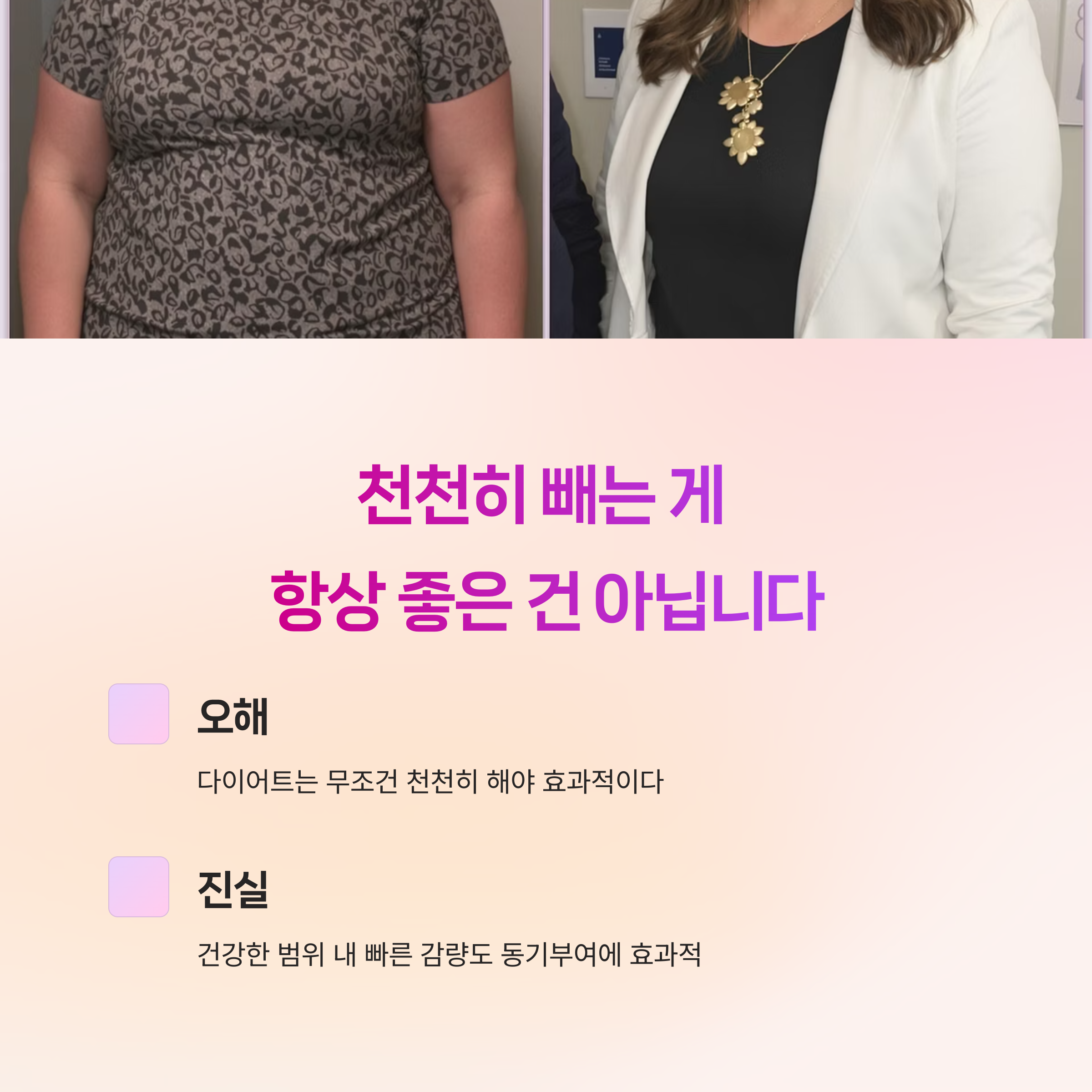 | 느린 감량 | 장기적으로 실천 가능 | 지루함 유발 가능 |