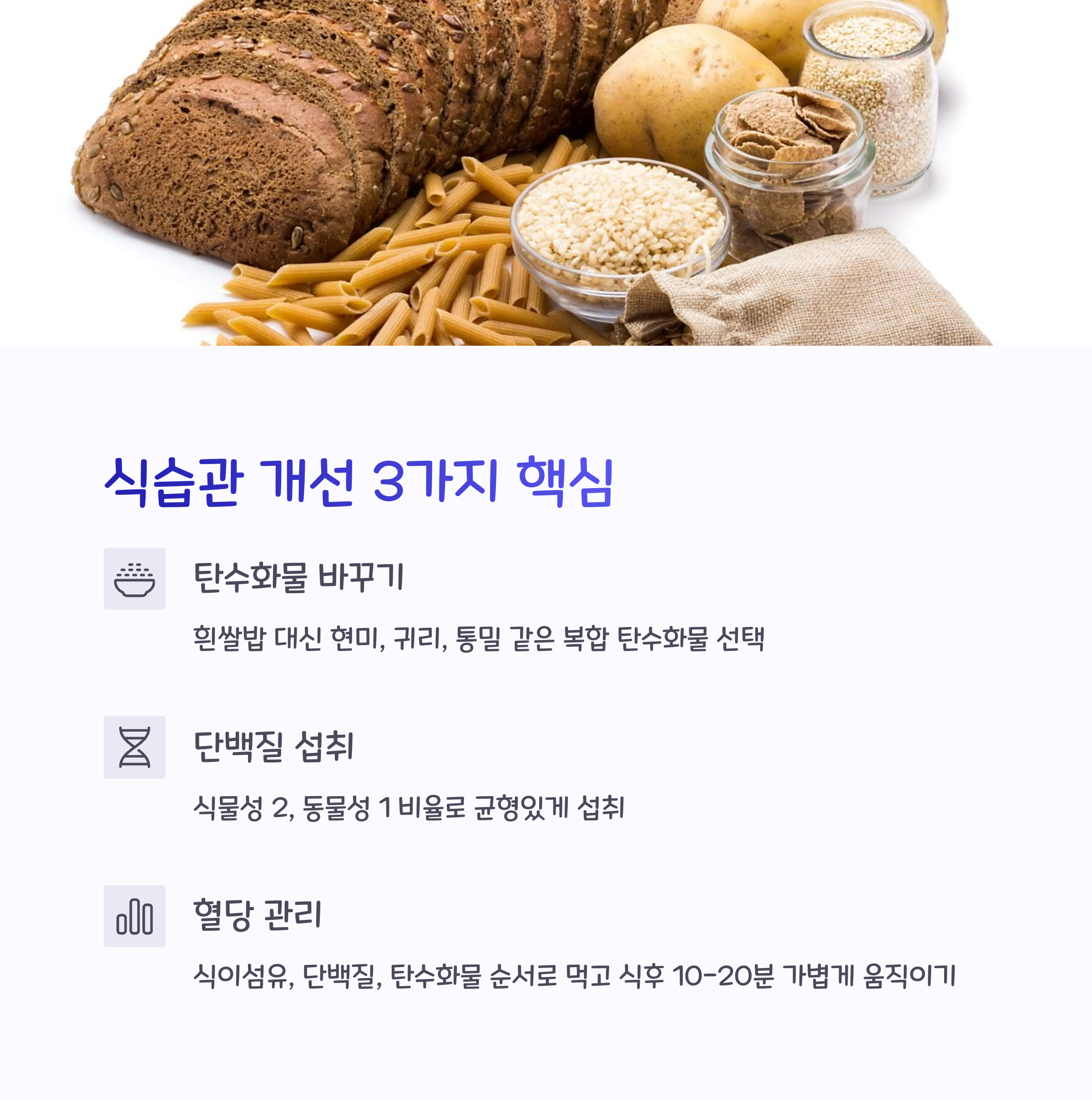 피해야 할 것: 흰쌀밥, 밀가루, 설탕, 과자, 빵 같은 정제된 탄수화물