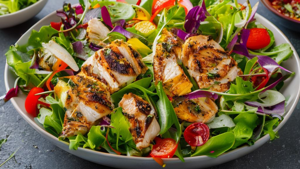 단백질 가득 샐러드: 신선한 채소에 구운 닭가슴살, 삶은 달걀, 아보카도를 얹고 엑스트라 버진 올리브 오일과 레몬즙으로 간단한 드레싱을 만들어 뿌려주세요.
