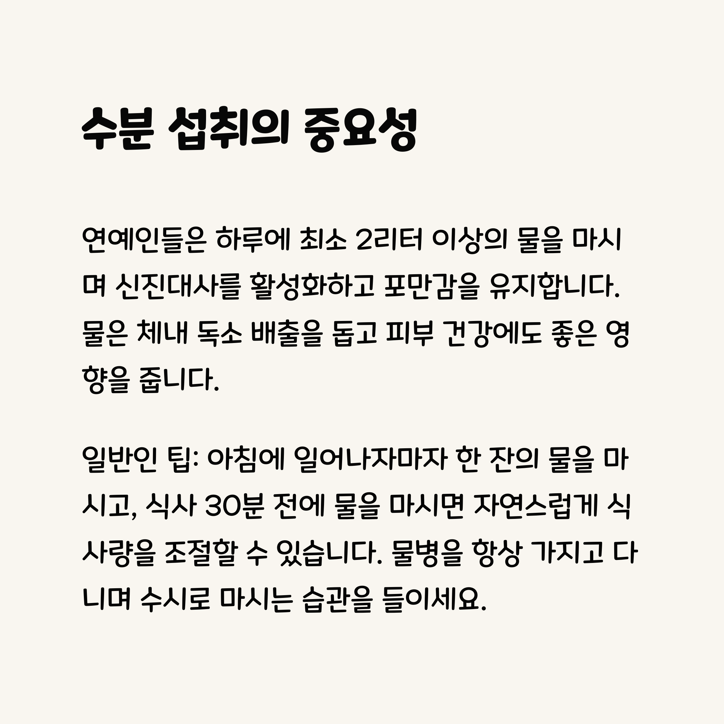 연예인들의 날씬한 몸매는 타고난 것이 아니라 지속적인 루틴과 철저한 관리의 결과입니다. 하지만 그들이 따르는 식단이나 운동법을 일반인이 그대로 따라 하기는 어렵죠. 그래서 우리는 연예인 루틴을 현실화하는 데 집중해야 합니다. 이 글에서는 아침 공복 유산소, 탄수화물 제한 식단, 수분 섭취량, 홈트레이닝 중심 루틴 등 연예인들이 실제로 실천 중인 방식들을 소개하고, 일반인도 부담 없이 실천 가능한 방식으로 바꿔보는 방법을 구체적으로 안내해 드립니다. 단순히 '따라 하기'가 아닌, 나에게 맞는 루틴을 만드는 방법, 그리고 무리하지 않으면서도 효과는 확실한 전략을 알려드립니다. 지금부터 건강하게 지속 가능한 다이어트 루틴, 함께 알아보시죠.