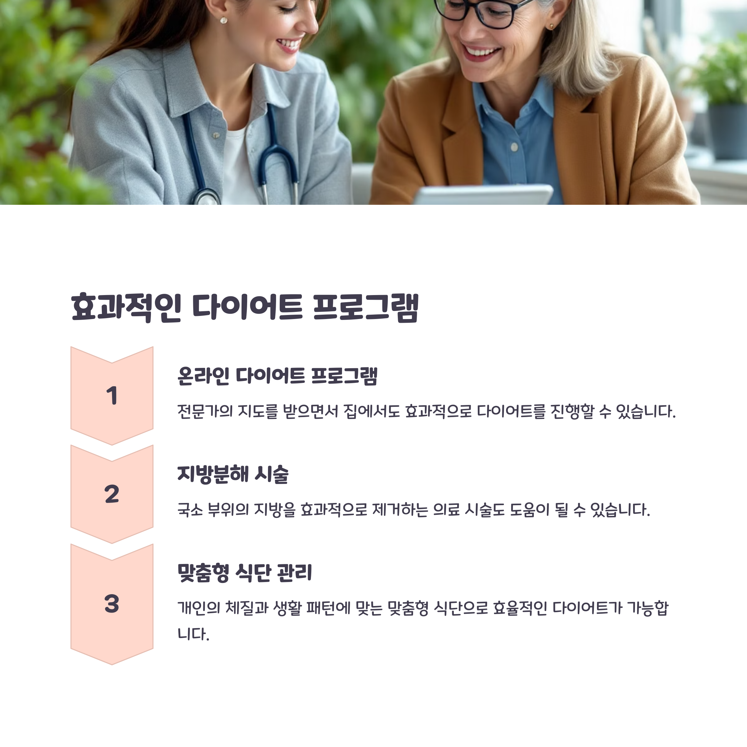 중년의 체중 감량은 단순히 외모를 위한 것이 아닙니다. 건강을 지키기 위한 전략이자, 삶의 질을 높이는 과정입니다. 무리하게 빠른 결과를 원하기보다는, 지금부터 꾸준하게 식단과 운동을 조절하고, 전문가의 도움을 받아 자신에게 맞는 방법을 찾아보는 것이 가장 중요합니다. 올바른 정보를 알고 실천하는 사람에게는 변화가 반드시 찾아옵니다. 오늘이 가장 빠른 시작이라는 것을 잊지 마세요.