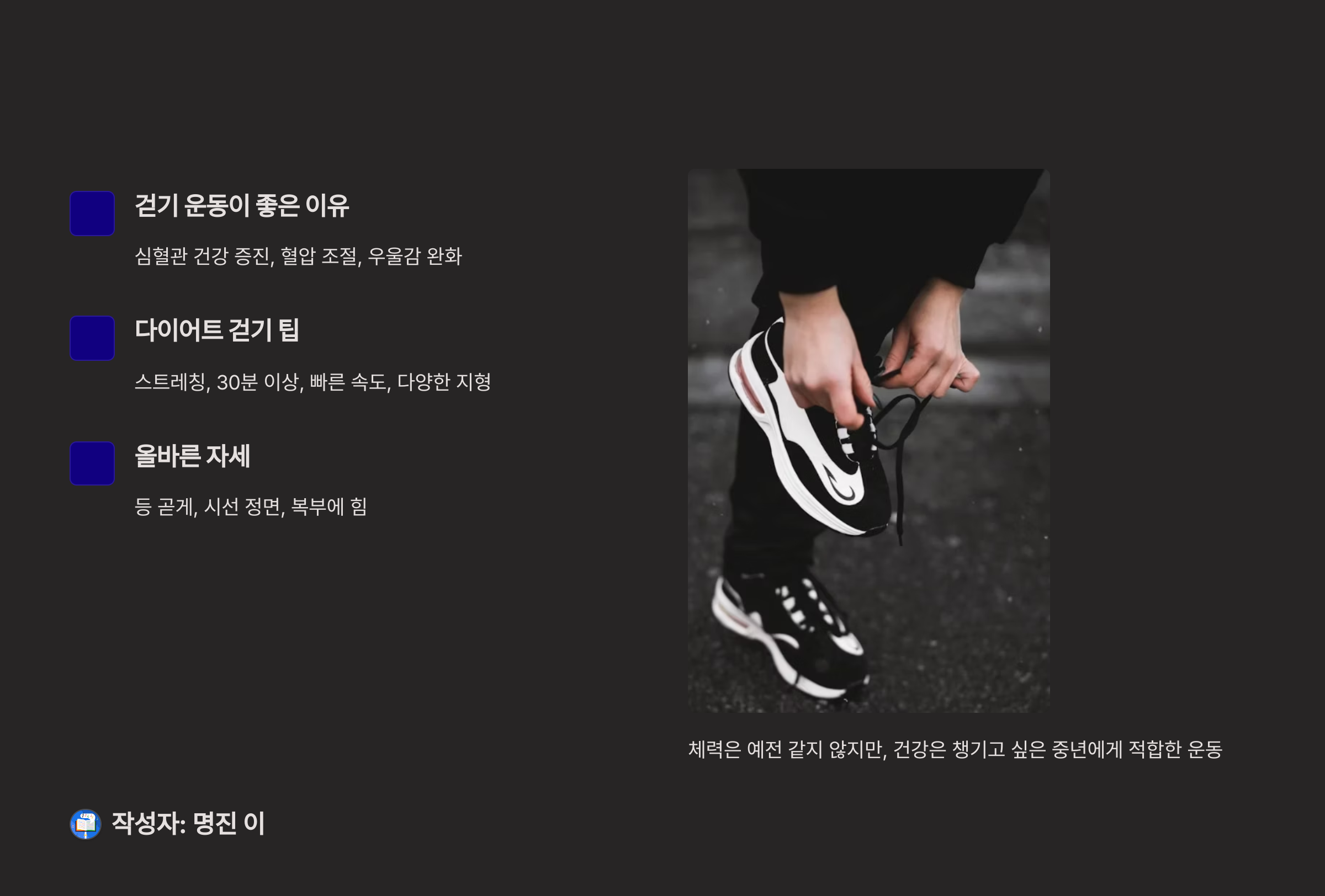많은 중년분들이 이 말을 하십니다. 중년기에는 무리한 운동보다 자신의 체력에 맞춘 걷기 운동이 가장 효과적이고 지속 가능합니다.