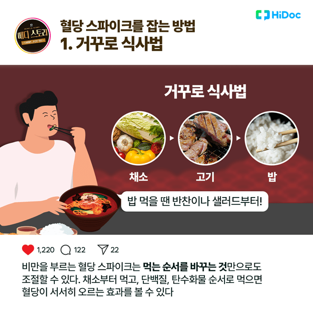 식사 순서는 혈당 조절에 매우 중요합니다. 예를 들어, 채소를 먼저 먹고 그 다음에 단백질, 마지막으로 탄수화물을 섭취하는 것이 좋습니다. 이렇게 하면 혈당이 천천히 오르고, 인슐린 분비도 안정적으로 이루어집니다.