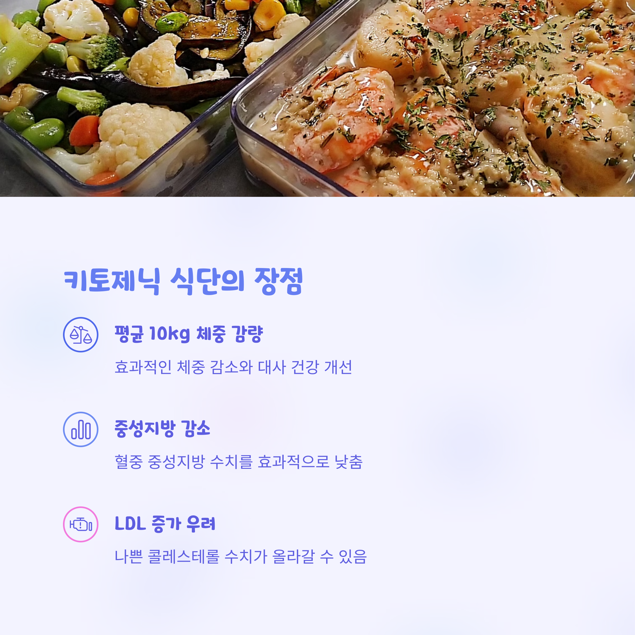 | LDL 증가 가능성, 심혈관 위험자 주의 필요 | LDL 감소, HDL 증가, 혈관 건강 유지에 탁월 | 12주간 평균 10kg 감량, 대사 지표 개선 동시 확인 |